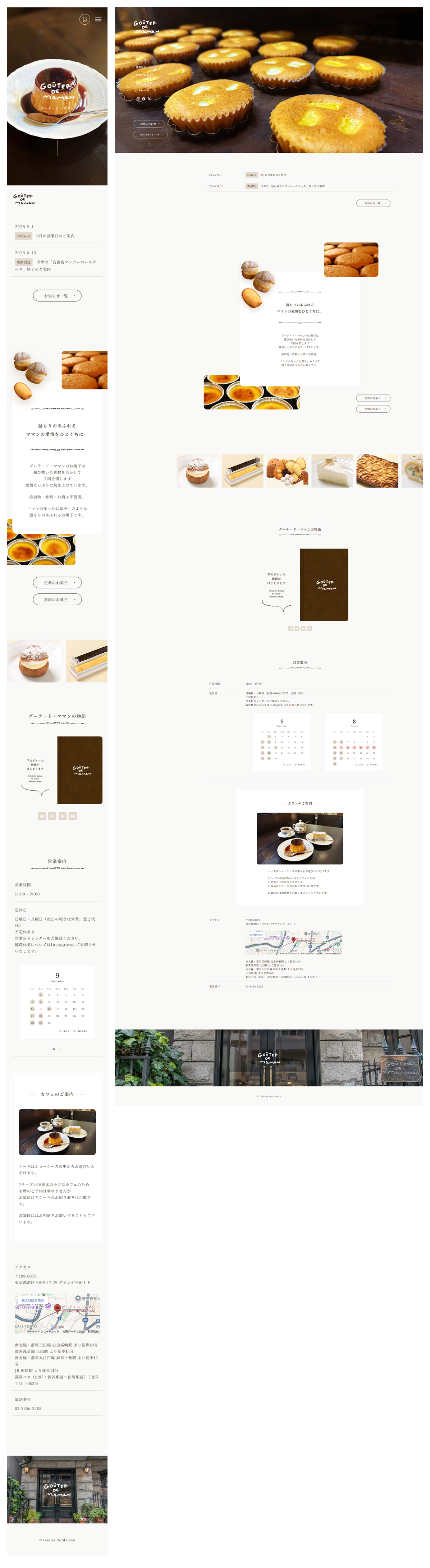 サイトのイメージごとに参考サイトを抽出し、オーナー様のデザインイメージを探りました。幾度ものお打ち合わせや修正を重ね、「シンプルにお店の情報が伝わりやすく」「主役のお菓子が引き立つように」「お店やお菓子の印象を崩さない上品さ」をコンセプトに。過度な装飾は加えず、全体をシンプルに仕上げました。あしらいも上品印象の手書きの素材を選定。商品名は、タイポグラフィ年鑑に掲載されたこともあるオーナーの直筆を採用。シンプルながら手書きの温かみを感じられる、「グーテ・ド・ママン」のお菓子を象徴するような仕上がりとなりました。