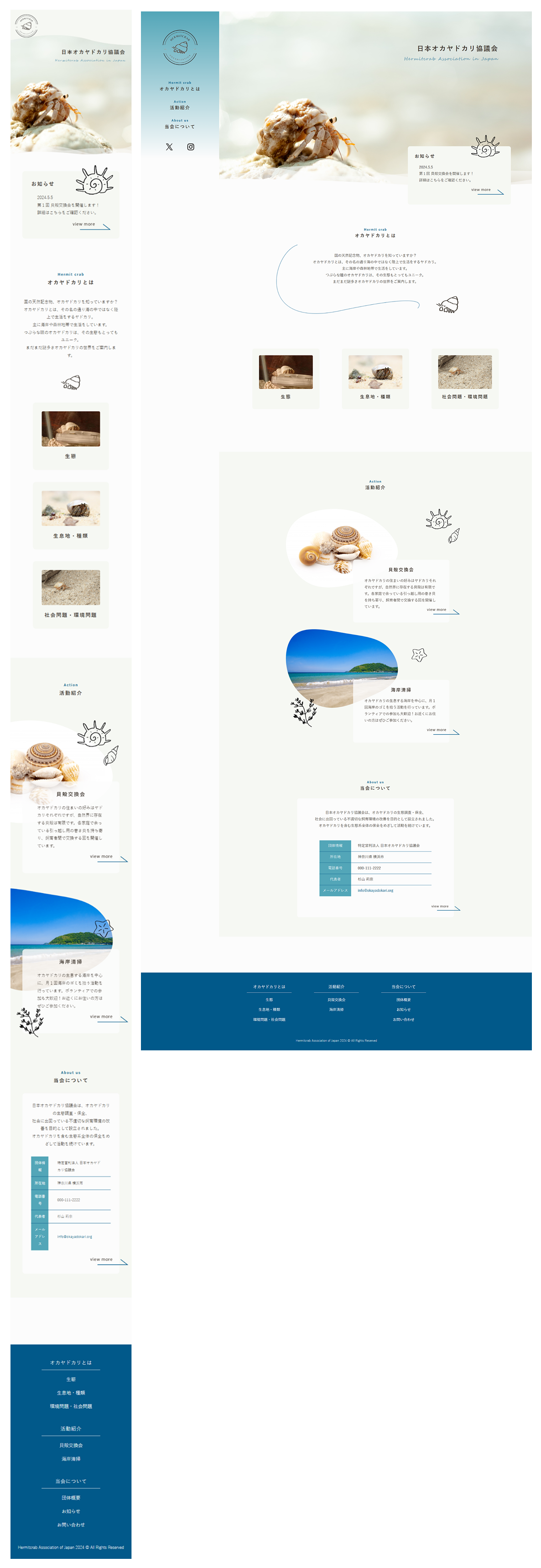自主制作として「NPO法人 日本オカヤドカリ協議会」のWebサイトをデザイン・構築しました。天然記念物に指定されているオカヤドカリの生態や、保護活動に関する情報を分かりやすく発信することを目的に、情報性と親しみやすさの両立を意識しています。